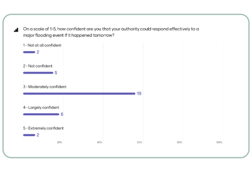 The session opened by asking how confident authorities would feel responding to a major flooding event if it happened tomorrow. Most delegates placed themselves in the middle of the scale, describing a position of moderate confidence rather than certainty. Only a small number felt extremely confident, while a meaningful minority still reported low confidence.
