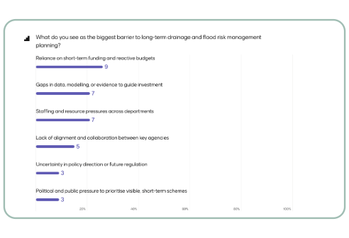 The clearest headline from the roundtable emerged when delegates were asked about the biggest barrier to long-term drainage and flood risk planning. The most common response was reliance on short-term funding and reactive budgets.